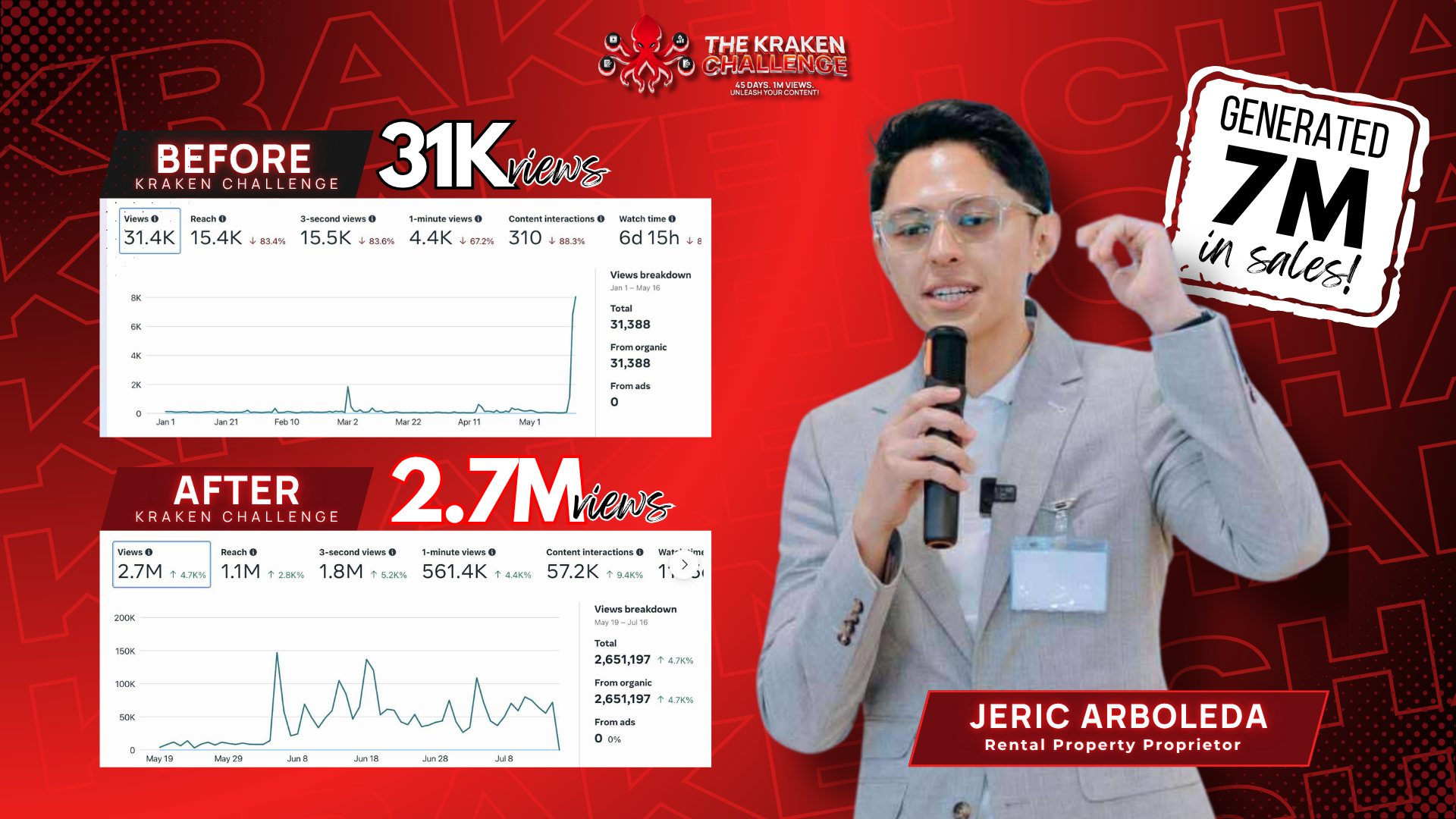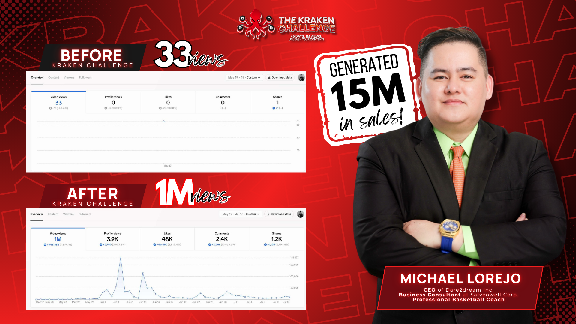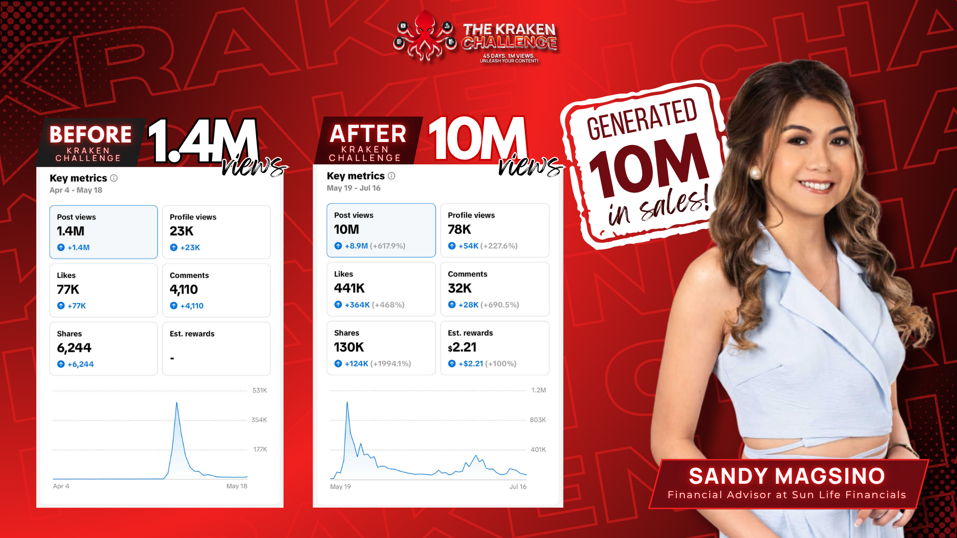 A 45-day, high-accountability content execution program with coaching, feedback loops, and a competitive community designed to help you hit 1M views and drive sales fast plus a chance to win up to ₱950,000 as the Kraken Champion.